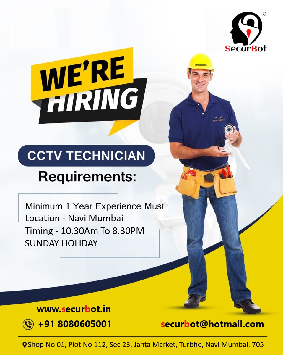 Looking for CCTV technicians, electricians and system installers for field work in Navi Mumbai to join SecurBot Surveillance team. Candidate we're hiring for should be an expert professional with minimum 1-years experience having worked in the CCTV field.